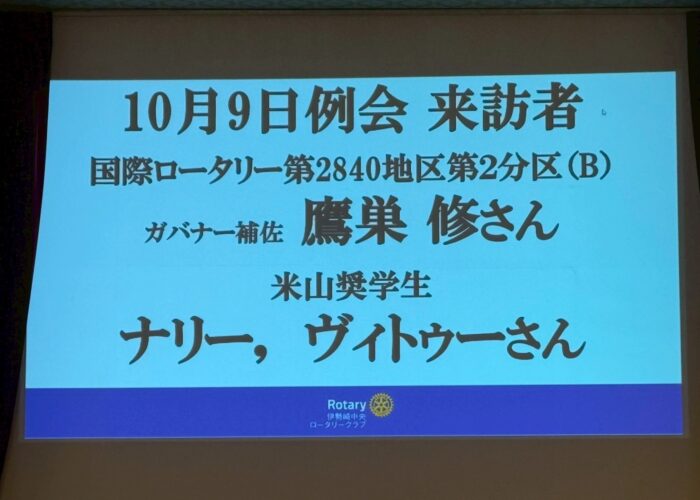 10/9例会 2025年10月9日 最終更新日時 : 2025年10月16日 rcisesakichuoh 鷹巣ガバナー補佐 事前協議訪問 卓話 故郷紹介 米山奨学生 ナリー,ヴィトゥーさん 鷹巣ガバナー補佐 事前協議訪問 卓話 故郷紹介 米山奨学生 ナリー,ヴィトゥーさん